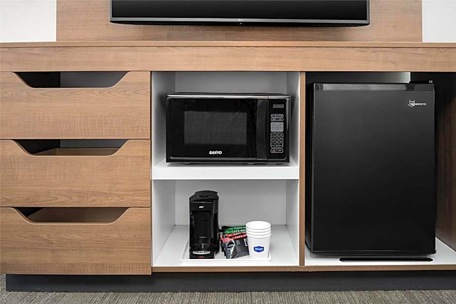 Cable TV is featured in this room. A microwave, small fridge, and coffee-making facilities are included.